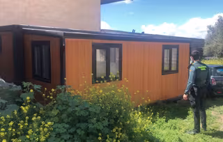 Los guardias civiles acudieron a la finca de Churriana de la Vega con las indicaciones que les había dado el transportista y allí localizaron la primera casa prefabricada ya montada e incluso conectada a la corriente eléctrica a través de un cable que iba hasta la nave cercana.