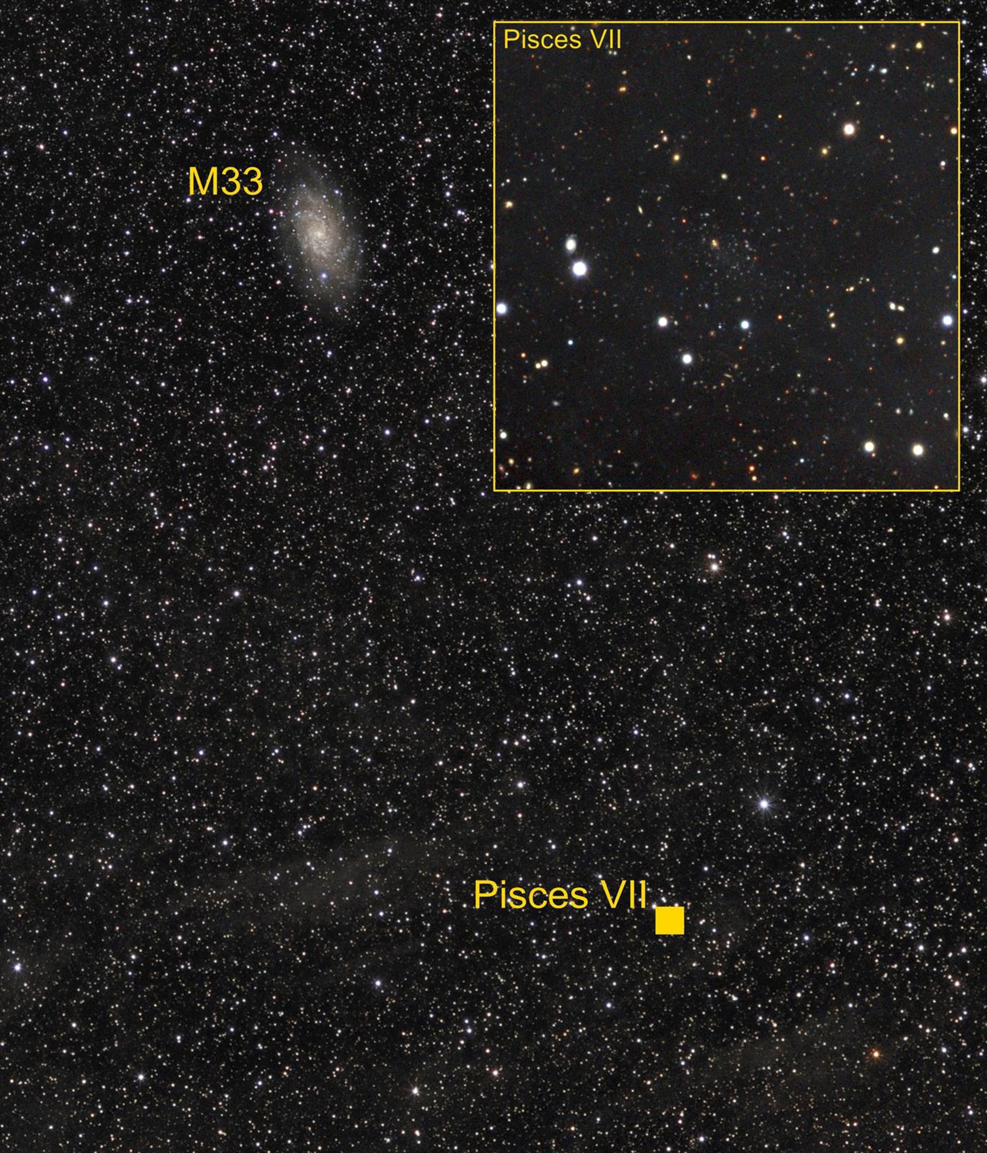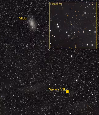 La nueva galaxia, llamada Pisces VII, fue detectada por el astrónomo aficionado Giuseppe Donatiello en los datos públicos del muestreo DESI Legacy surveys por inspección visual. Para confirmarla, el equipo científico empleó datos más profundos obtenidos con el telescopio TNG de 3,5 metros, que permitieron medir su distancia y su magnitud absoluta. Los análisis sugieren que podría tratarse de un satélite de M33, pero la estimación de distancia resulta muy compleja y cabría otra posibilidad: si estuviera más lejos, sería la galaxia enana más aislada detectada hasta ahora.