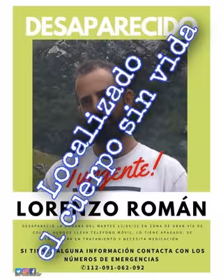 Lorenzo Román desapareció el día 13 de septiembre en el centro de la capital granadina. El hombre se encontraba en tratamiento y necesitaba medicación, por lo que se inició un amplio dispositivo de búsqueda entre agentes de la Policía Nacional y Local, Bomberos de Granada y voluntarios para dar con su paradero.