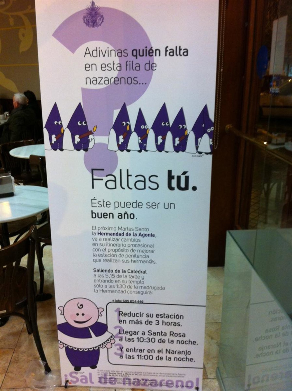 La Hermandad de la Agonía de Córdoba, con motivo del cambio que se ha impuesto en su itinerario procesional, ya que esta próxima Semana Santa saldrá desde la Catedral y no desde la Parroquia de Santa Victoria, en el Barrio del Naranjo, está haciendo campaña para captar nazarenos, intentando captar a los potenciales interesados con unos llamativos cartelones.