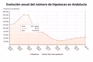 Evolución anual del número de hipotecas en Andalucía hasta el mes de agosto, difundidos este martes por el INE. - EP DATA