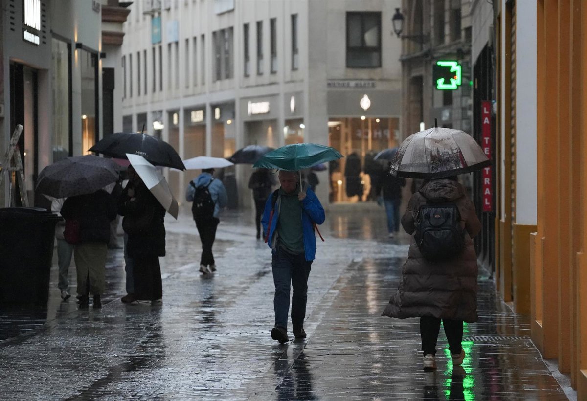 Transeúntes por céntricas calles de Sevilla se protegen de la lluvia que la borrasca Leonardo deja a su paso. A 4 de febrero de 2026, en Sevilla (Andalucía, España). - María José López - Europa Press