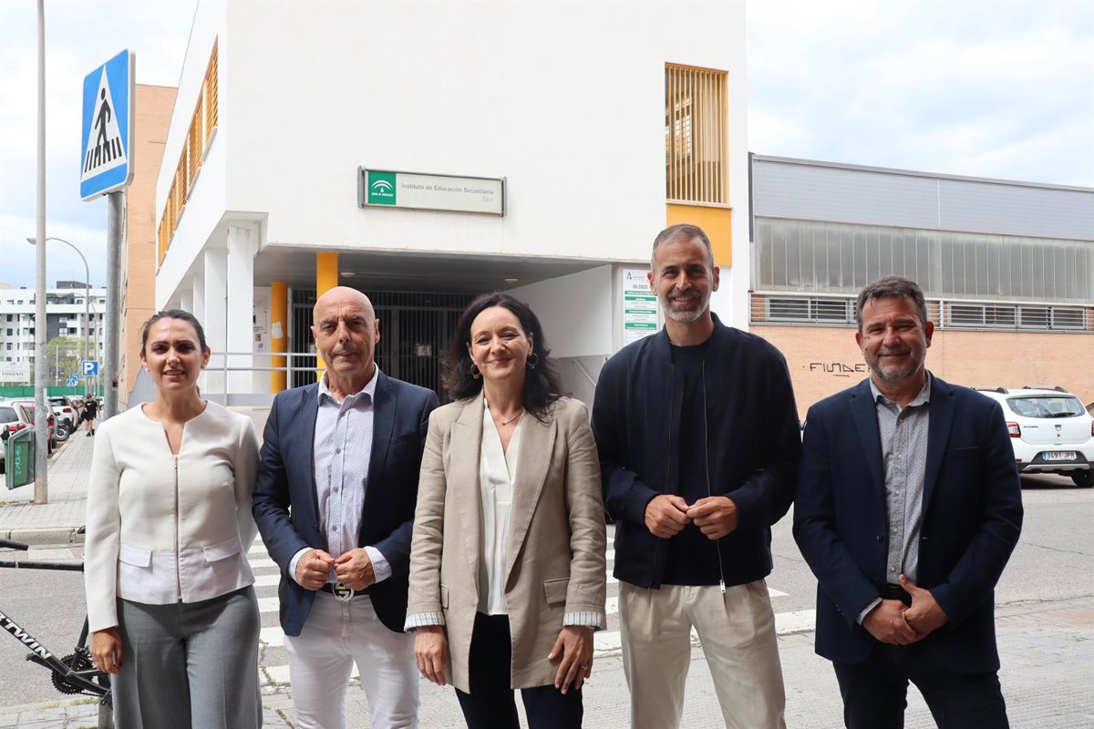 Hurtado (2º izda.) y Crespín (centro), junto a los ediles del PSOE Carmen González, Ángel Ortiz y Joaquín Dobladez (dcha.), ante el IES Zoco. - PSOE