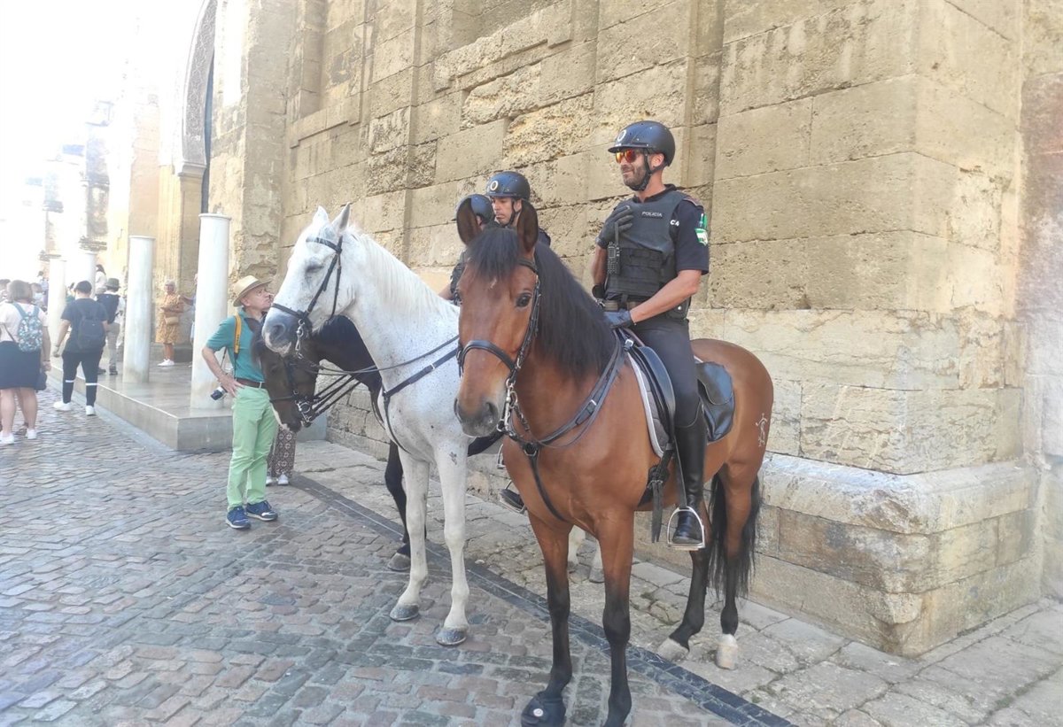 Policías locales a caballo atienden a turistas junto a la Mezquita-Catedral de Córdoba. - EUROPA PRESS