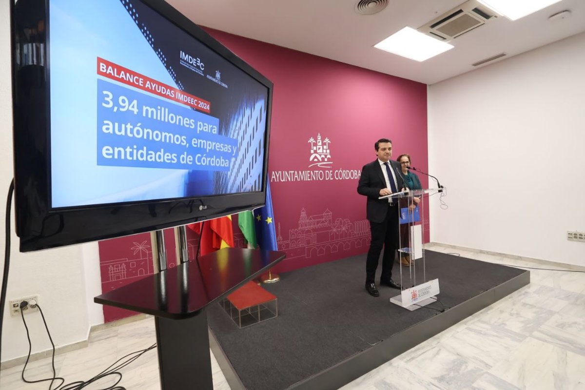 El alcalde de Córdoba, José María Bellido, y la presidenta del Instituto Municipal de Desarrollo Económico y Empleo (Imdeec), Blanca Torrent, han hecho balance este martes de las ayudas concedidas por dicho ente en 2024, que ascienden a 3,94 millones de euros, abonados "en tiempo récord", de los que se han beneficiado 746 pequeñas y medianas empresas y autónomos, de cara a la creación de unas 300 empresas y casi 600 empleos, la mitad de ellos para mujeres.