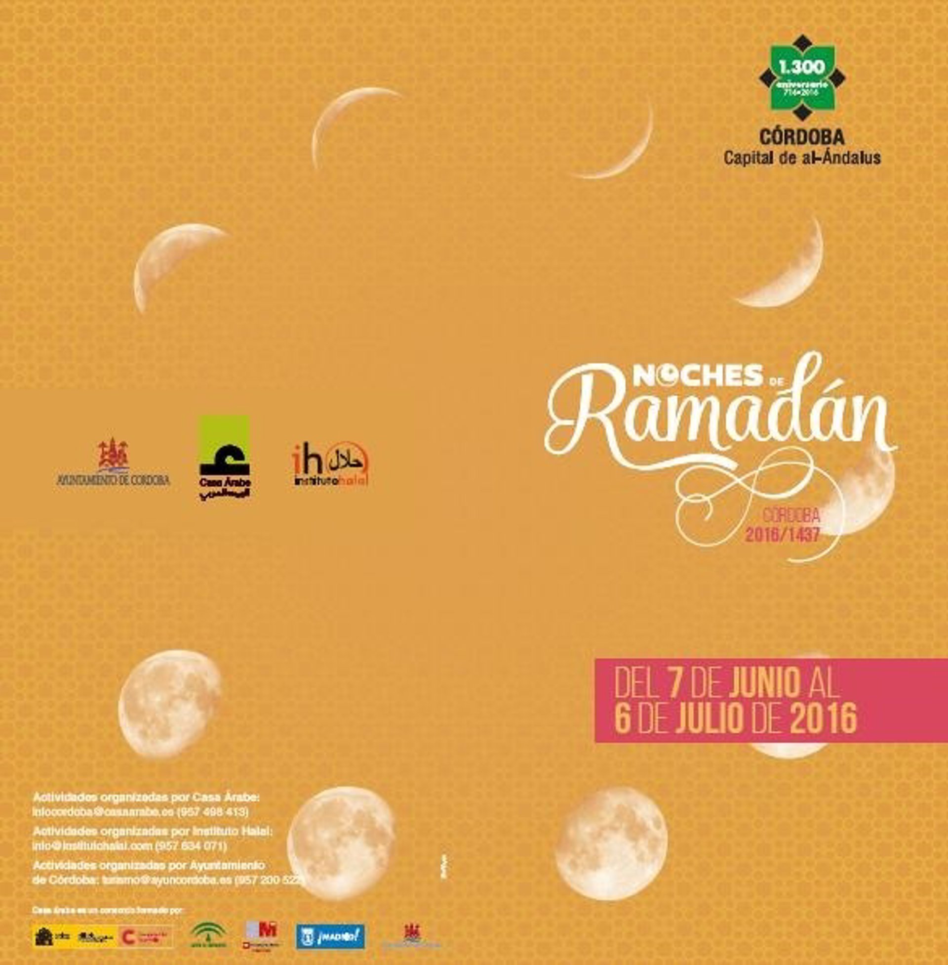 El Ayuntamiento y la Diputación de Córdoba, junto con Casa Árabe, el Instituto Halal y la Universidad de Córdoba (UCO), han previsto la celebración, desde este martes 7 de junio y hasta el próximo 6 de julio, de múltiples actividades para conmemorar el 1.300 aniversario de Córdoba como capital de al-Andalus, mediante 'Noches de Ramadán. Córdoba 2016/1437'.