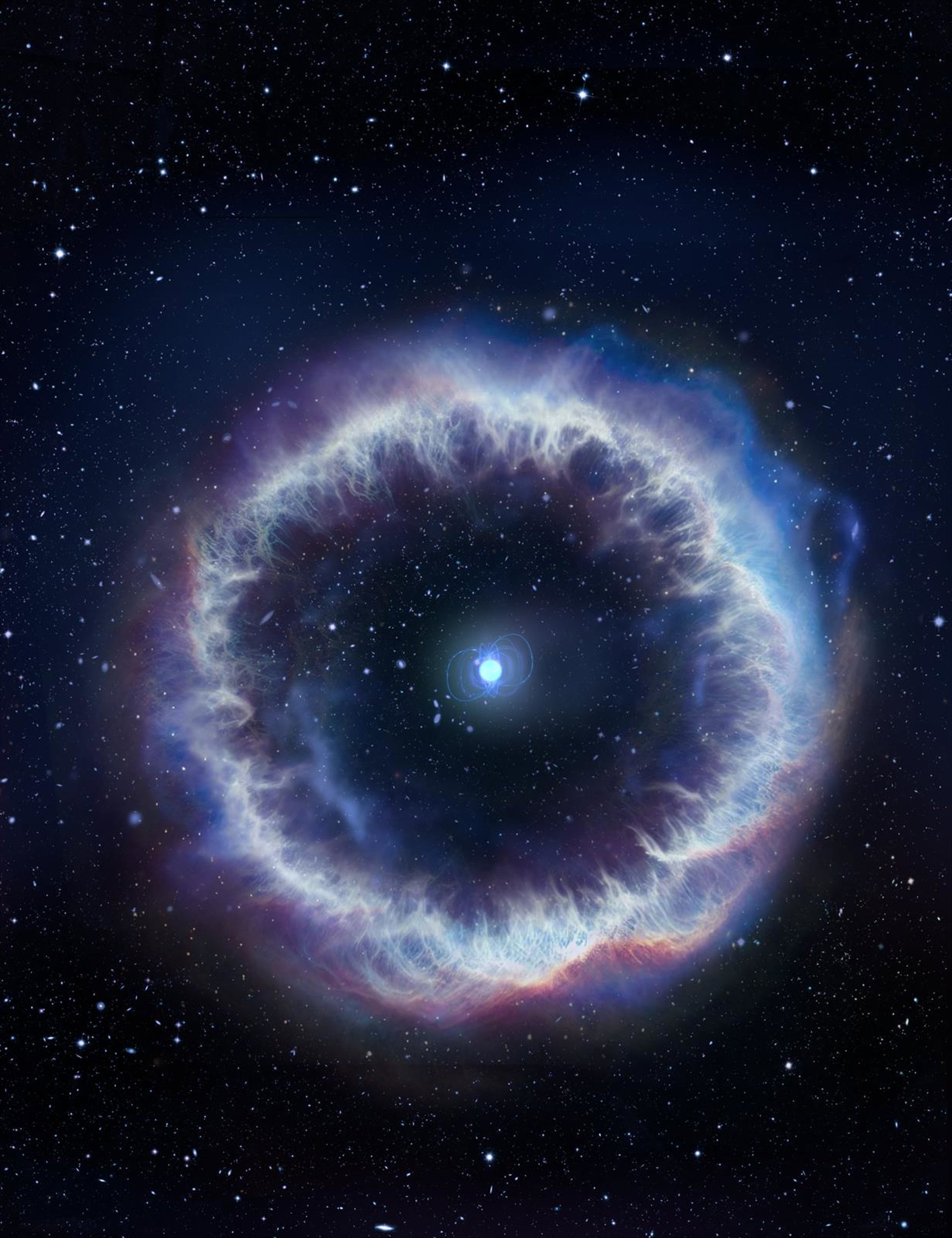 Representación artística de un magnetar rodeado por la nebulosa responsable de la emisión radio asociada a algunas ráfagas rápidas de radio - US NSF/AUI/NSF NRAO S. DAGNELLO