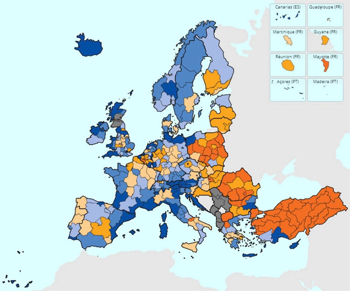 Mapa con las regiones de la UE coloreadas en relación a su dependencia del turismo. En naranja las que tienen menor dependencia y en gris las que no ofrecen información. - UGR