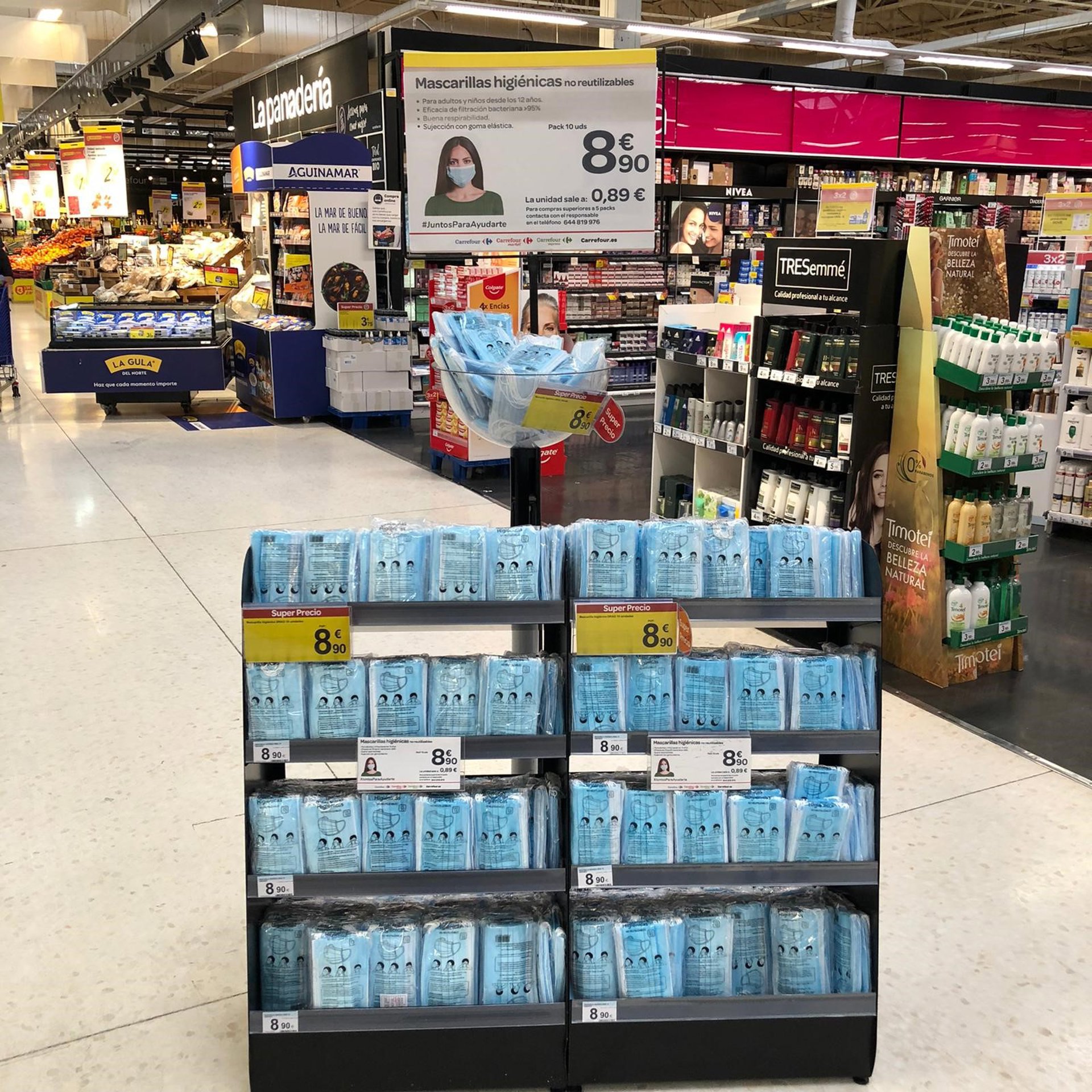 Imagen de archivo de un stand con mascarillas contra el coronavirus en un centro Carrefour. - CARREFOUR - Archivo