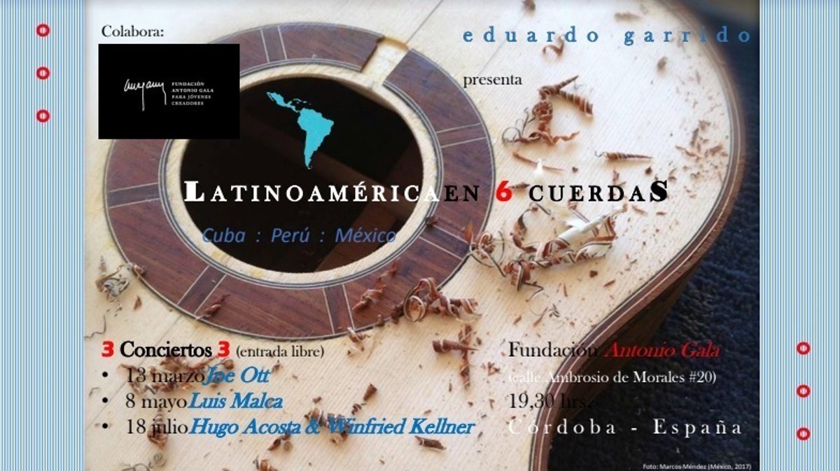La Fundación Antonio Gala para Jóvenes Creadores acoge el próximo martes, a las 19,30 horas y con entrada libre hasta completar aforo, el primer concierto de guitarra del ciclo 'Latinoamérica en 6 cuerdas', a cargo del guitarrista y compositor cubano, Joe Ott, que bajo el título 'De España al Nuevo Mundo' interpretará obras de Tárrega, Joaquín Rodrigo, Isaac Albéniz, Leo Brouwer y Villa-Lobos, entre otros.