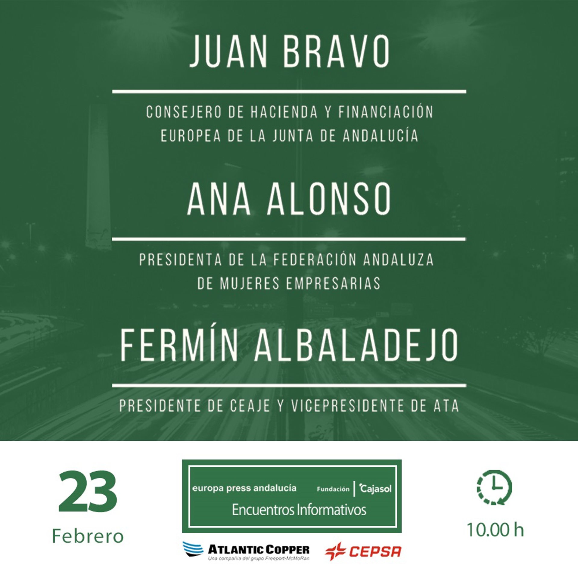 Europa Press Andalucía celebrará este próximo miércoles, 23 de febrero en Sevilla, con el patrocinio de la Fundación Cajasol, Atlantic Copper y Cepsa, una nueva edición de sus encuentros informativos en formato presencial con la participación del consejero andaluz de Hacienda y Financiación Europea, Juan Bravo; la presidenta de la Federación Andaluza de Mujeres Empresarias, Ana Alonso, y el presidente de la Confederación Española de Asociaciones de Jóvenes Empresarios (Ceaje) y vicepresidente de ATA, Fermín Albadalejo.