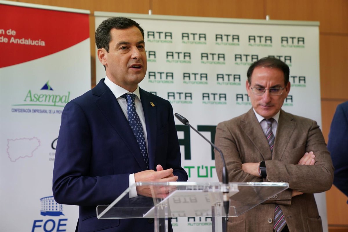 El presidente de la Junta, Juanma Moreno, y el presidente de la CEA, Javier González de Lara, en la inauguración de la sede de ATA en Andalucía en julio de 2019 . - Junta de Andalucía - Archivo