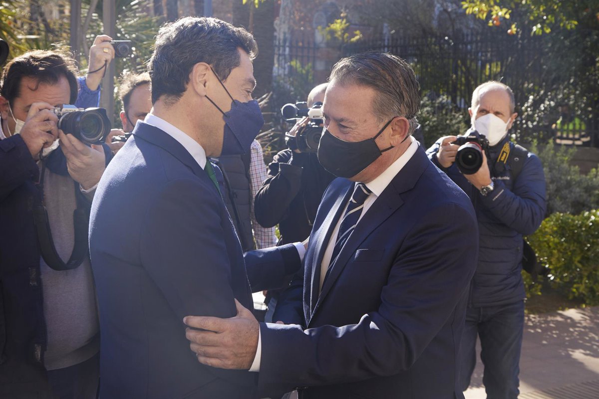 El presidente de la Junta, Juanma Moreno, (i) saluda al Alcalde de Linares, Raúl Caro, (d) durante el Consejo de Gobierno de la Junta de Andalucía en la Antigua Estación de Linares, a 7 de febrero de 2022 en Jaén (Andalucía, España) - Joaquin Corchero - Europa Press