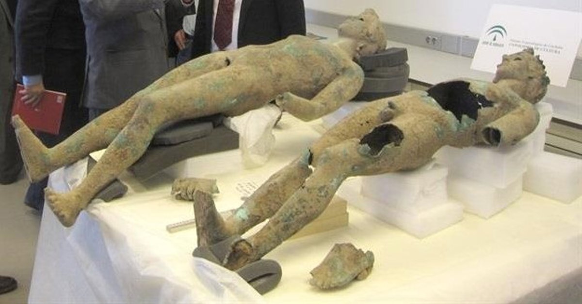 Según el primer informe de arqueólogos de la Delegación Territorial de Cultura de la Junta de Andalucía, las piezas proceden del Alto Imperio Romano. Son dos figuras de estilo muy parecido al Efebo de Antequera, una de las piezas más importantes a nivel europeo de este tipo de representaciones. Fueron entregadas al Museo Arqueológico de Córdoba para su restauración.
