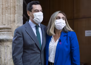 El presidente de la Junta de Andalucía, Juanma Moreno, (i); junto a la consejera de Fomento, Marifrán Carazo (d), tras la aprobación final del proyecto de Ley de Impulso para la Sostenibilidad del Territorio de Andalucía, durante la segunda jornada del - María José López - Europa Press