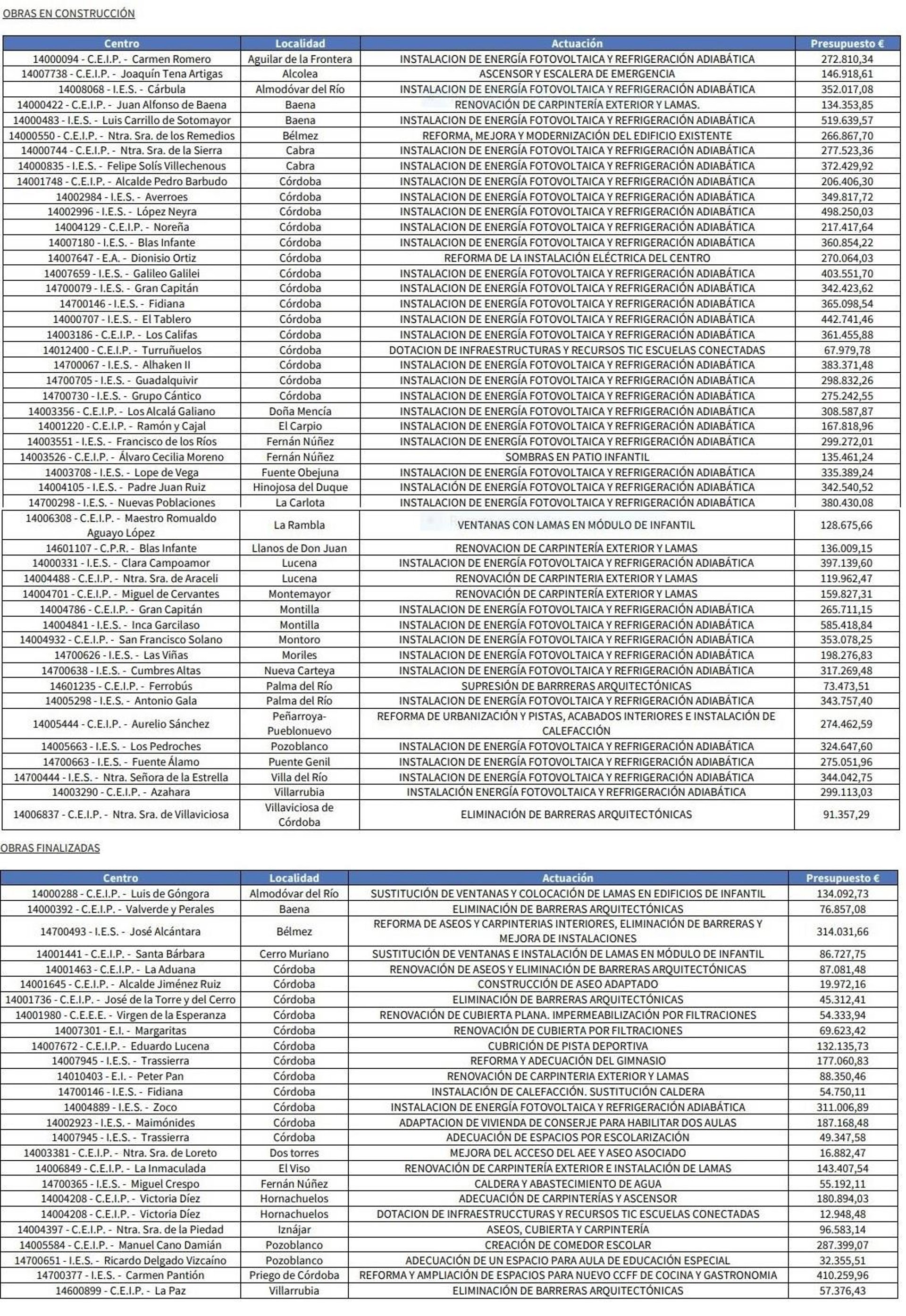 Cuadro de las obras en ejecución y ya concluidas este año por la Junta en colegios e institutos de Córdoba. - JUNTA DE ANDALUCÍA