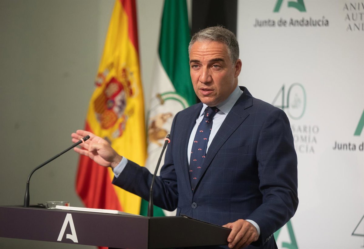 El consejero de la Presidencia y portavoz del Gobierno andaluz, Elías Bendodo, este martes en la rueda del prensa posterior a la reunión del Consejo de Gobierno. - María José López - Europa Press