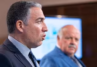 Rueda de prensa posterior al Consejo de Gobierno. El consejero de Presidencia, Elías Bendodo (i) junto al consejero de Salud y Familias, Jesús Aguirre, (d). - Jesús Prieto - Europa Press