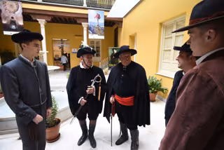El cortejo lo formaban el Hermano Mayor de la Hermandad que ostentaba la vara de alcalde y llevaba bolsa, el secretario de la Hermandad, otros hermanos con bolsa y otros haciendo el papel de pregonero y de alguaciles armados de sable, les acompañaban tocadores de guitarra y bandurria.