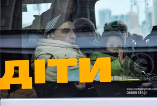 Personas sentadas en un autobús de evacuación en Kiev - Sergei Chuzavkov/Zuma Press/ContactoPhoto/Sputnik