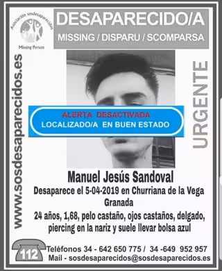 Así lo ha señalado la asociación SOS Desaparecidos en su cuenta oficial de Twitter, en un mensaje que ha sido compartido por la Policía Local de Granada, que ha agradecido a través de las redes sociales la colaboración ciudadana para dar con el paradero de Manuel Jesús Sandoval, un joven con pelo y ojos castaños, delgado, de 1,68 centímetros de altura y con un pendiente en la nariz.