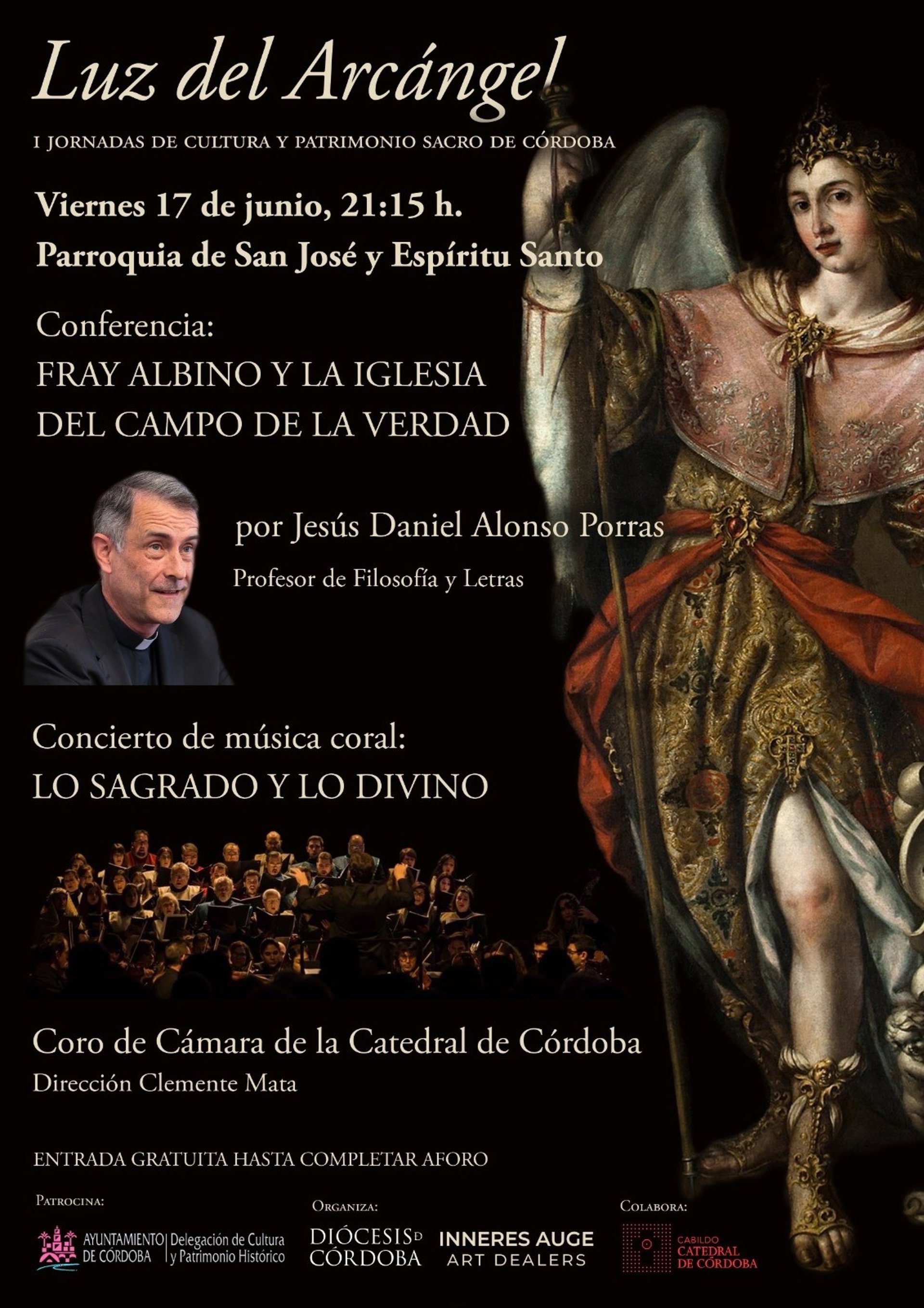 Las I Jornadas de Cultura y Patrimonio Sacro de Córdoba 'Luz del Arcángel', organizadas por la Diócesis y el Cabildo Catedral de Córdoba, con el patrocinio del Ayuntamiento de la capital cordobesa, ofrece este viernes, a partir de las 21,15 horas en la Parroquia de San José y Espíritu Santo, el concierto de música coral 'Lo sagrado y lo divino', interpretado por el Coro de Cámara de la Catedral y dirigido por Clemente Mata.