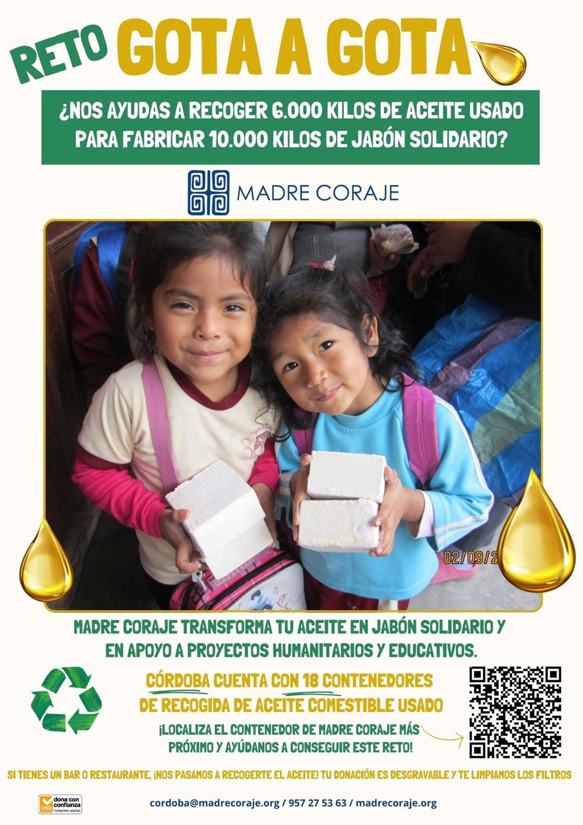 La Fundación Madre Coraje invita a particulares, bares y restaurantes de Córdoba a sumarse a un reto solidario, el de recoger 6.000 kilos de aceite usado en dos meses y transformarlo en 10.000 kilos de jabón "solidario" para Perú y Mozambique, poniendo así en marcha el reto 'Gota a Gota', una iniciativa que busca mejorar las condiciones de higiene de comunidades empobrecidas en dichos países.