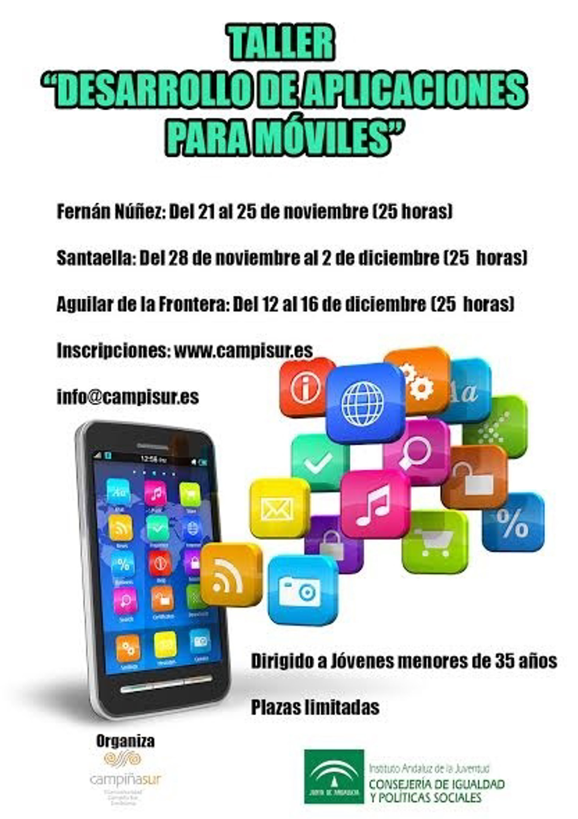 Así lo indicó en su momento la Mancomunidad de Municipios Campiña Sur Cordobesa en una nota en la que concretó que se van a llevar a cabo seis talleres formativos dirigidos a jóvenes menores de 35 años, preferentemente desempleados. Tres de ellos son sobre 'Cloud Computing: Herramientas para trabajar en la Nube', y los tres restantes están destinados a 'Desarrollo de Aplicaciones para Móviles', teniendo una duración de 25 horas.