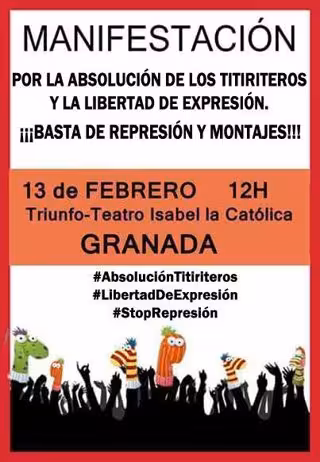 El Grupo Stop Represión del Movimiento 15M de Granada ha organizado para este sábado una manifestación-pasacalles en Granada para reclamar la retirada de cargos de los dos titiriteros detenidos en Madrid, la libertad de expresión y contra el "incremento de la represión política y social".
