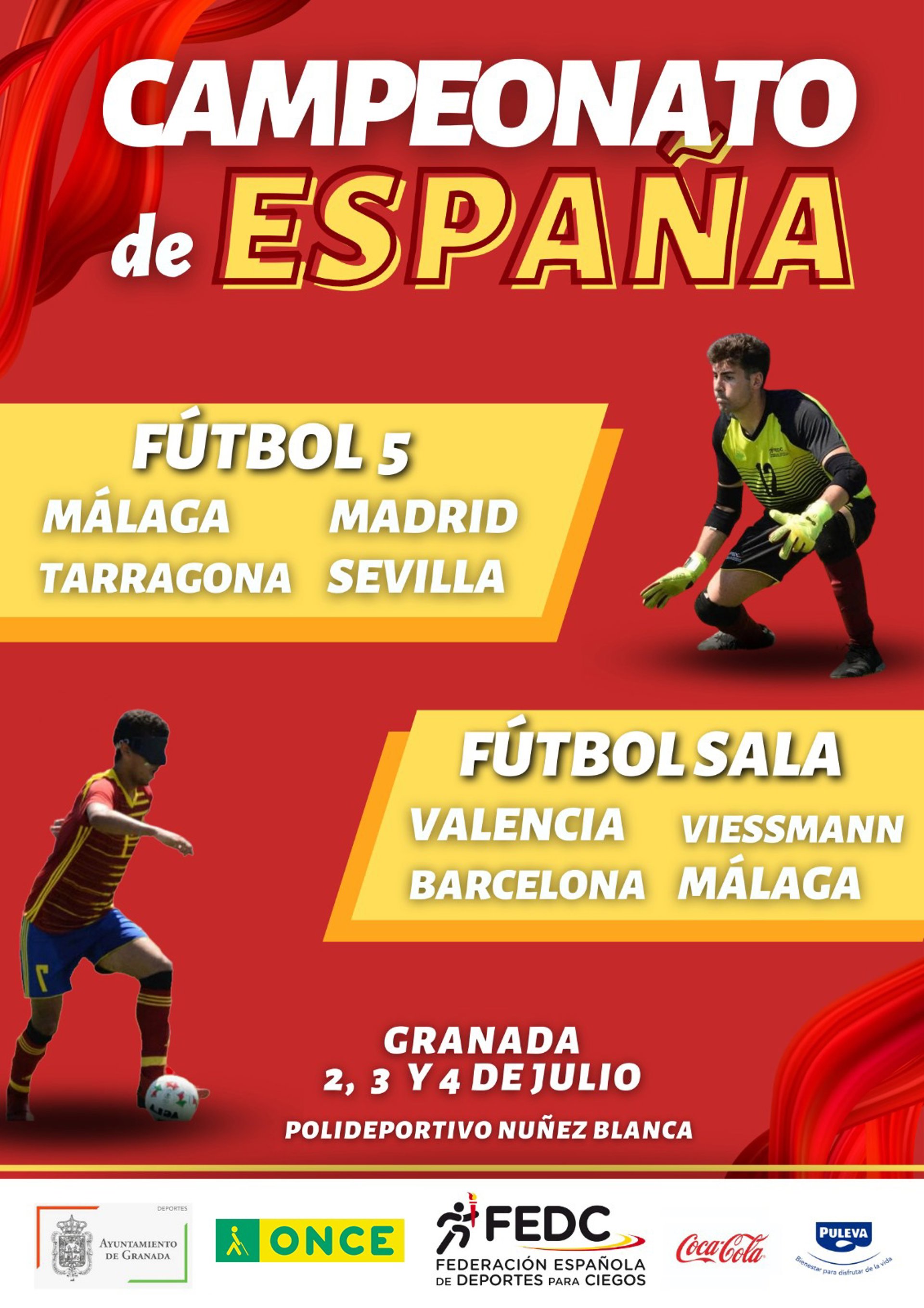 Los mejores futbolistas ciegos y con discapacidad visual disputarán este fin de semana en Granada los Campeonatos de España de fútbol para ciegos y fútbol sala, organizados por la Federación Española de Deportes para Ciegos con la colaboración de la ONCE y el Ayuntamiento de Granada, y el patrocinio de Coca-Cola y Puleva.