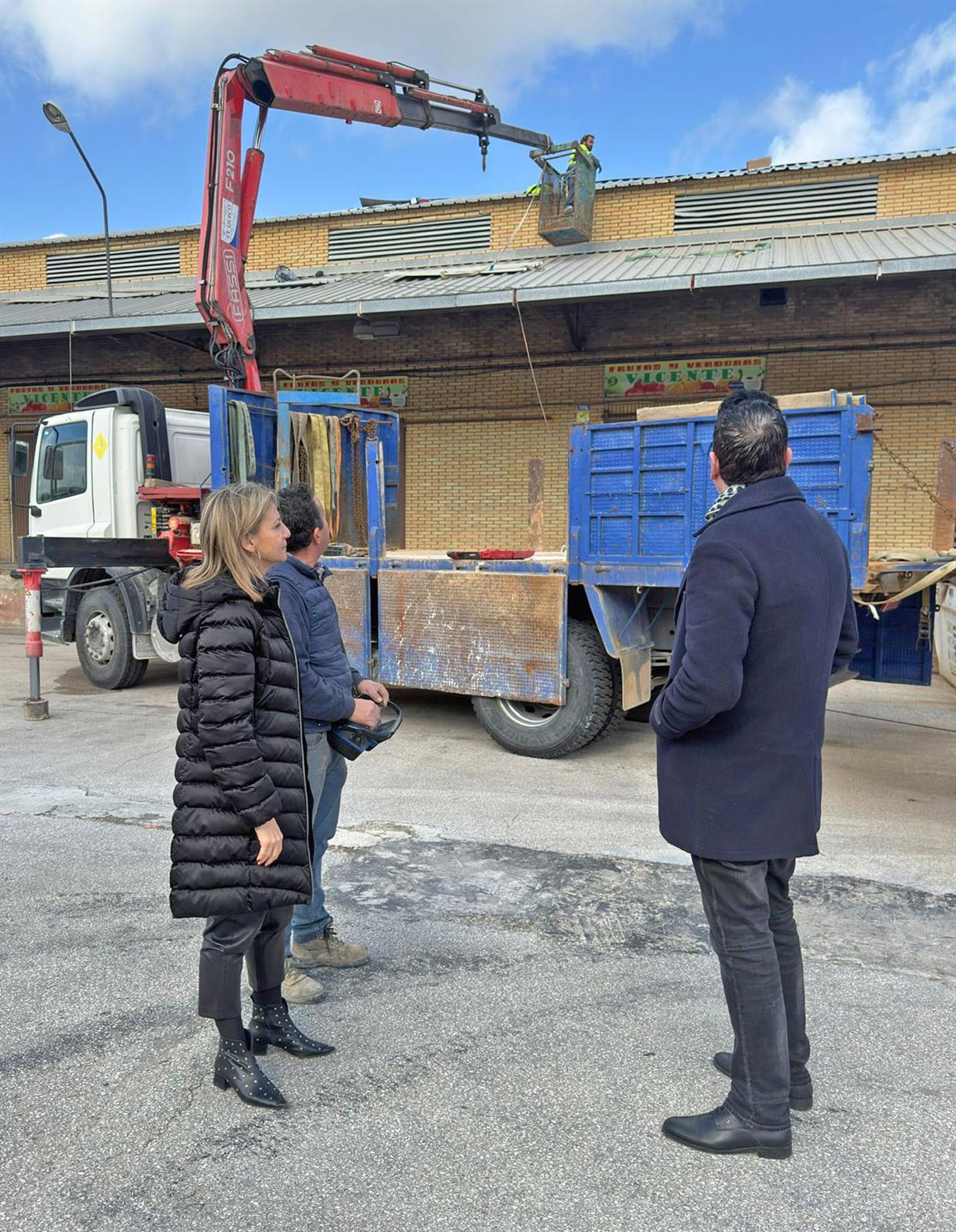 La concejala Isabel Cano-Caballero observa las tareas para reparar la cubierta en el mercado de mayoristas. - AYUNTAMIENTO DE JAÉN