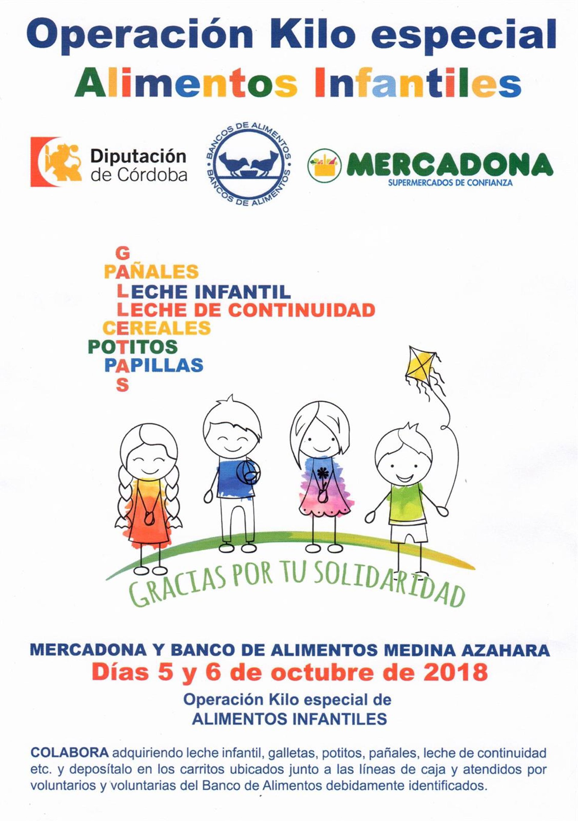 El Banco de Alimentos Medina Azahara de Córdoba y Mercadona organizarán los días 5 y 6 de octubre una campaña de recogida de alimentos infantiles en 28 establecimientos de la cadena de supermercados en la provincia cordobesa.