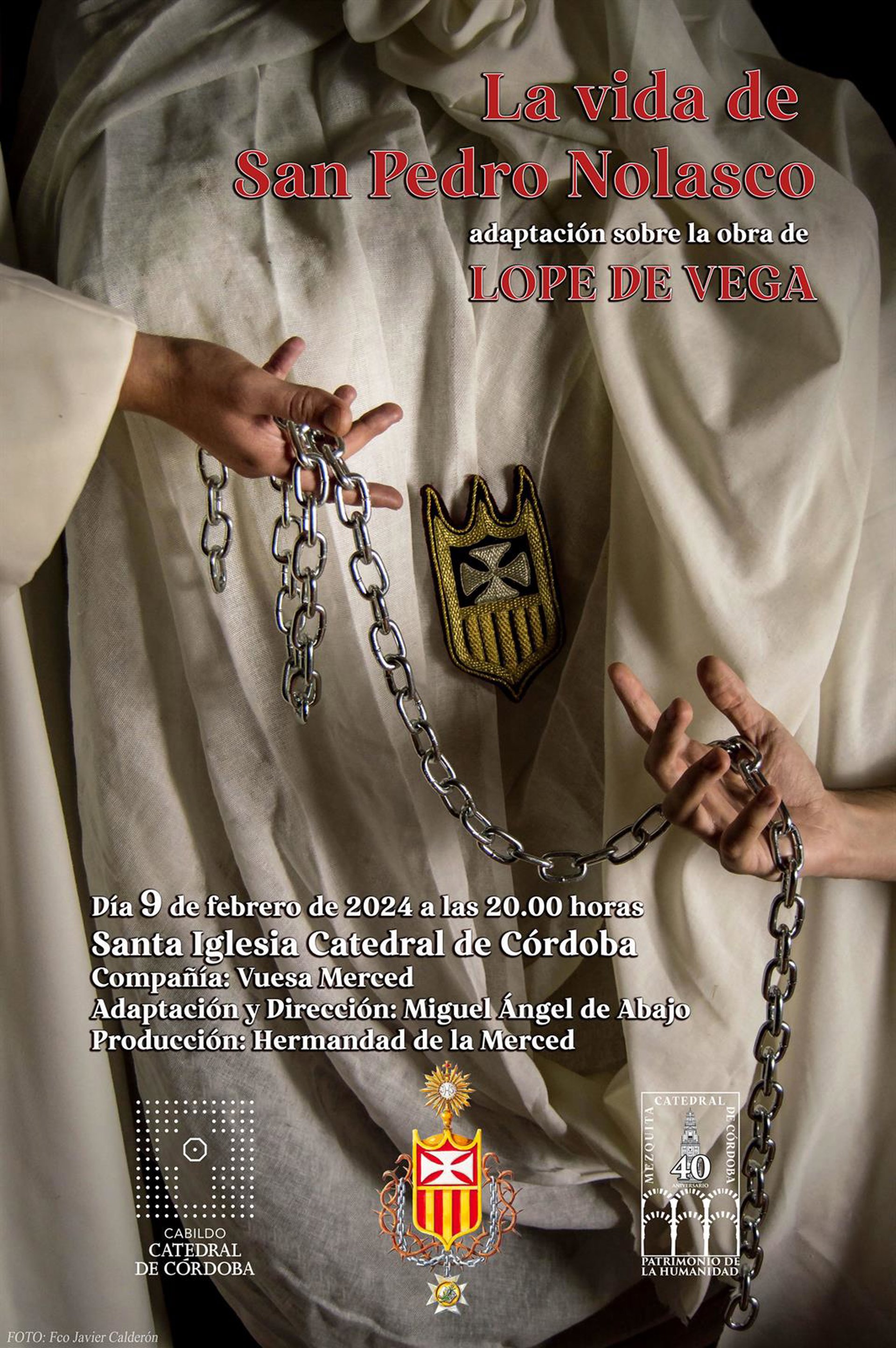Dentro del programa de actos conmemorativos del 40 aniversario de la Declaración de la Mezquita-Catedral de Córdoba como Patrimonio de la Humanidad por la Unesco, el Cabildo Catedral, junto con la compañía de teatro 'Vuesa Merced', perteneciente a la Hermandad de la Merced, organiza la representación este viernes a las 20,00 horas en la Mezquita de la obra de Lope de Vega 'La Vida de San Pedro Nolasco'.