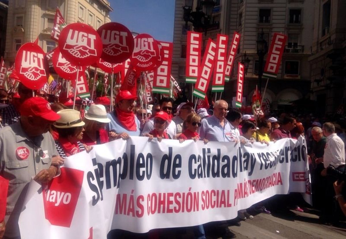Miles de personas se han manifestado este jueves con motivo del Día Internacional del Trabajo por las calles de las principales ciudades andaluzas en las manifestaciones convocadas por los dos sindicatos mayoritarios, UGT-A y CCOO-A, que en Granada han celebrado el acto central de Andalucía, con el lema 'Sin empleo de calidad no hay recuperación. Más cohesión social para más democracia' y que ha servido para reclamar "un cambio de rumbo" en las políticas actuales encaminado hacia la "justicia social".