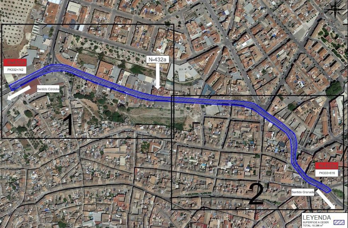 El expediente contempla la cesión sin cargo del tramo de la carretera N-432A, comprendido entre los puntos kilométricos 332+742 y 333+616. La longitud del tramo a ceder es de 874 metros, con una superficie estimada de 10.286 metros cuadrados.