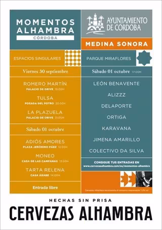 Momentos Alhambra Medina Sonora, iniciativa que nació en 2018 de la mano del Ayuntamiento de Córdoba y Cervezas Alhambra con el objetivo de conmemorar el nombramiento de Medina Azahara como Patrimonio de la Humanidad por la Unesco, prepara su cuarta edición con conciertos gratuitos durante el fin de semana del 30 de septiembre y el 1 de octubre con artistas como Romero Martín, La Plazuela o Adiós Amores, entre otros.