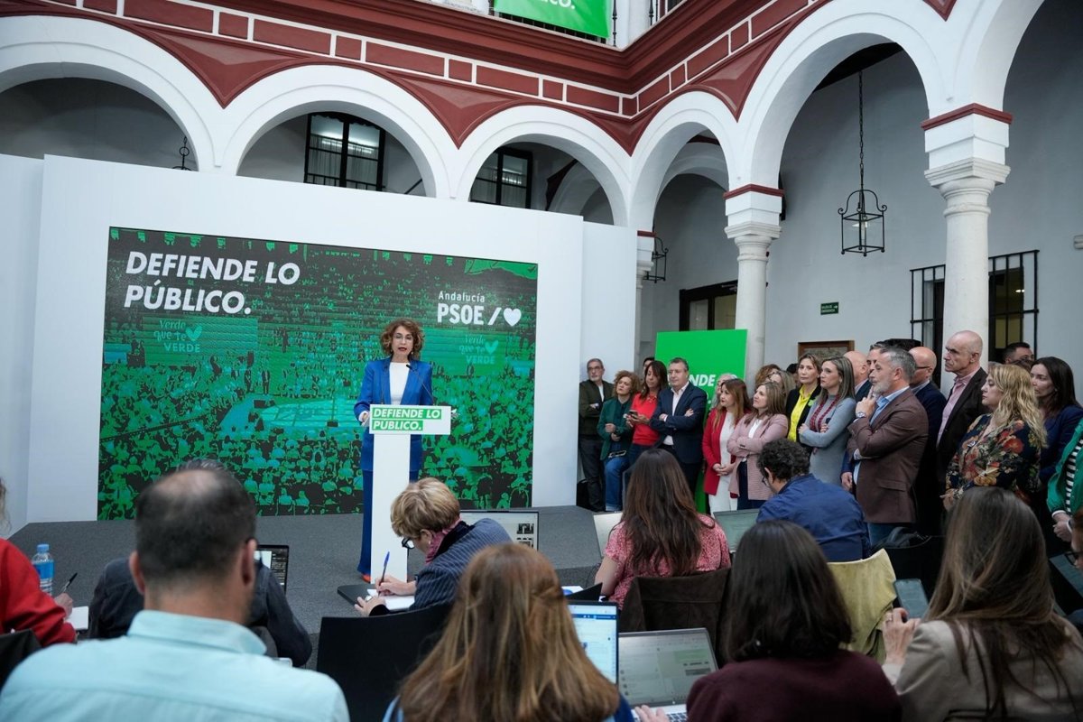 La secretaria general del PSOE-A, María Jesús Montero, comparece en rueda de prensa en la sede del PSOE-A en Sevilla. - JOAQUÍN CORCHERO/EUROPA PRESS