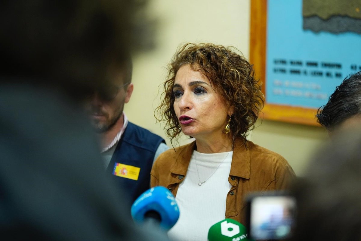 La vicepresidenta primera del Gobierno, María Jesús Montero, en declaraciones a los medios en El Palmar de Troya (Sevilla), uno de los municipios más afectados por el temporal. - JOAQUÍN CORCHERO-EUROPA PRESS