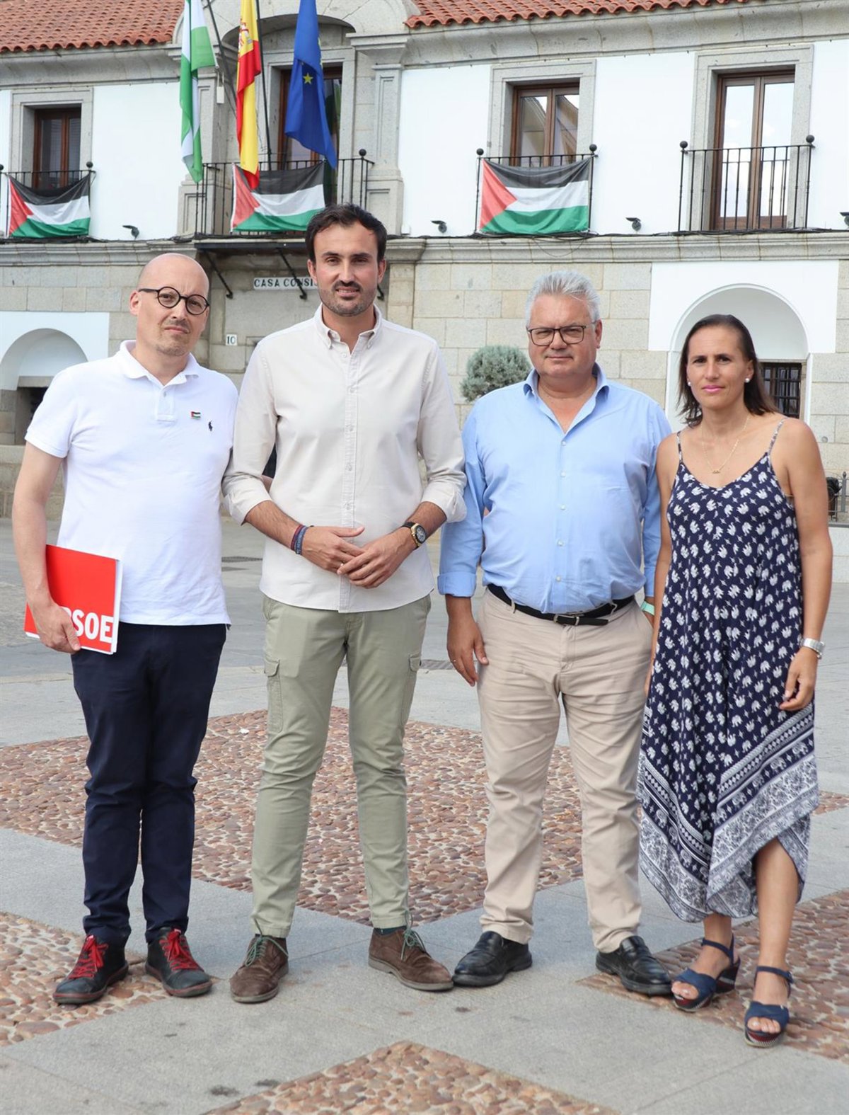 Isaac Reyes y Esteban Morales (centro), ante el Ayuntamiento de Villanueva de Córdoba. - PSOE