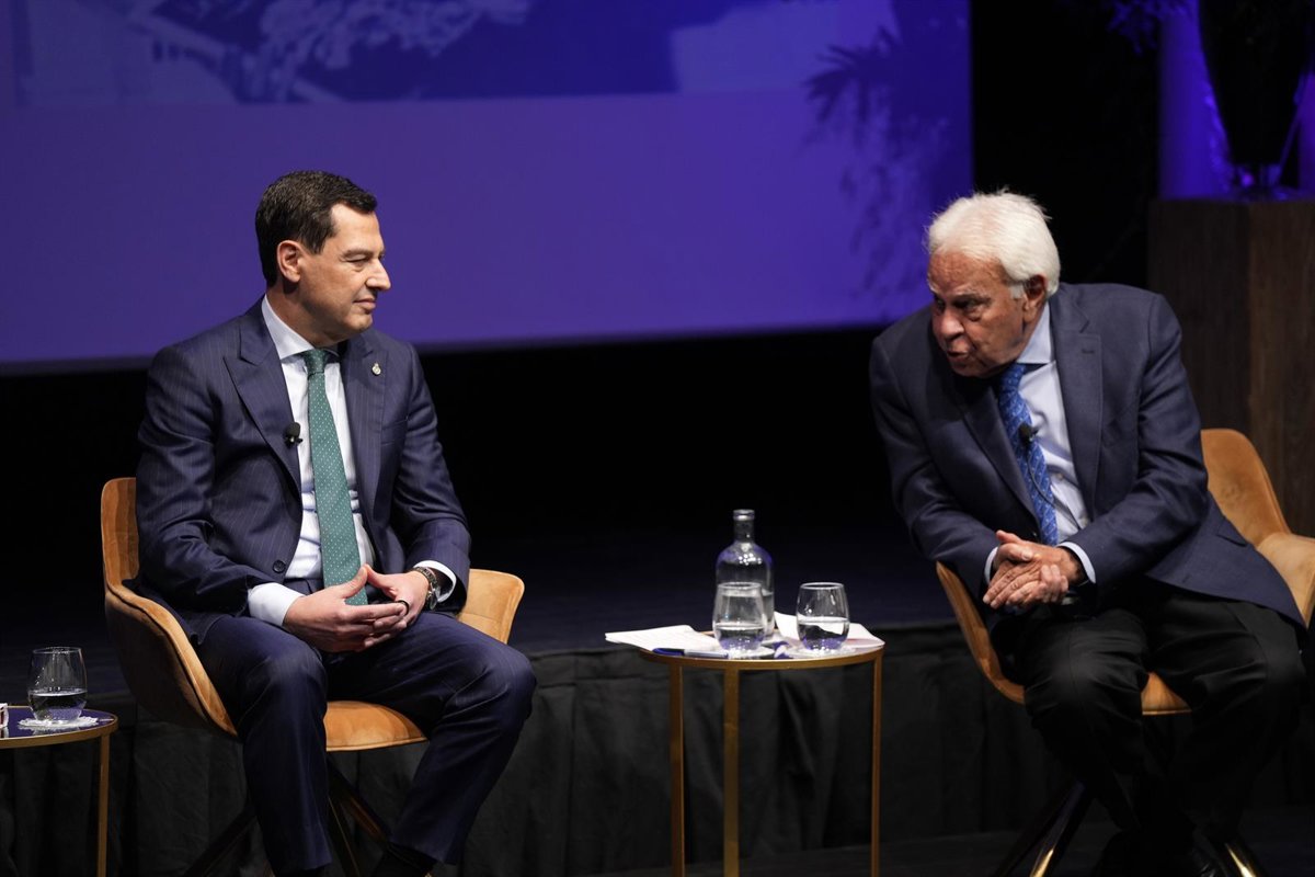 El presidente de la Junta de Andalucía, Juanma Moreno, y el expresidente del Gobierno Felipe González, este jueves en Sevilla durante la charla inaugural de un ciclo dedicado al centenario del nacimiento de la Duquesa de Alba. - Joaquín Corchero - Europa Press
