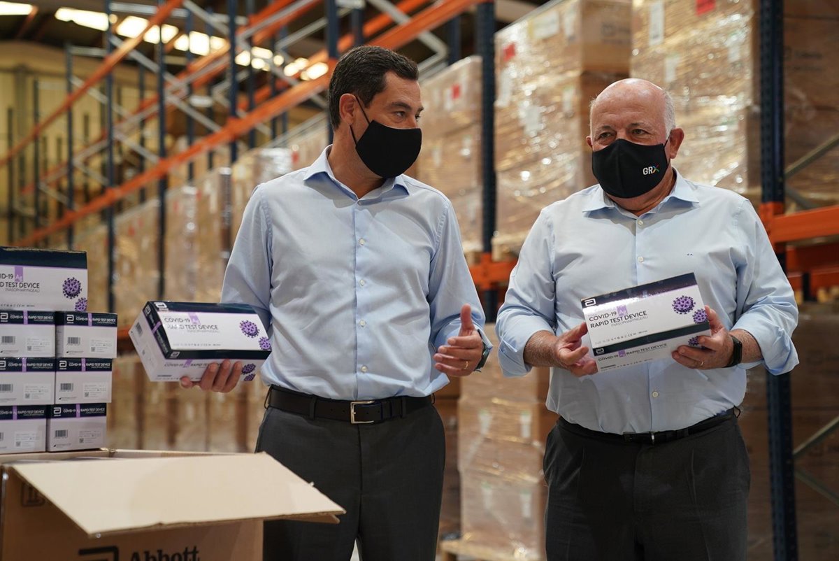 El presidente de la Junta de Andalucía, Juanma Moreno, ha acudido este viernes al nuevo centro logístico regional y provincial de Granada a donde ha llegado la mitad del millón de test rápidos adquiridos recientemente por el Gobierno andaluz y ha considerado que, con la compra de estas pruebas diagnósticas, la comunidad autónoma se sitúa "a la vanguardia en la lucha contra la Covid-19".