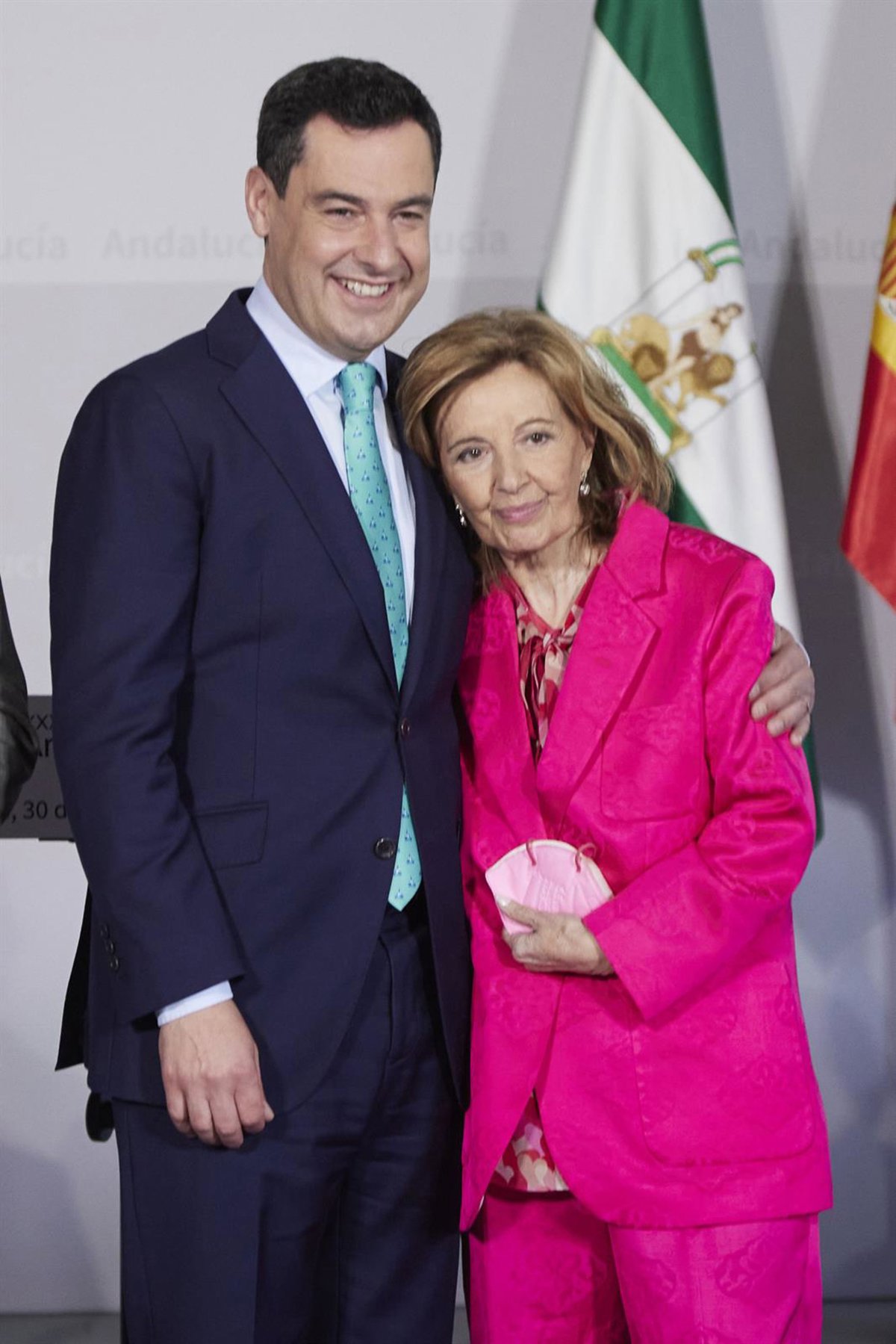 Archivo - El presidente de la Junta, Juanma Moreno, abraza a la periodista, María Teresa Campos, durante la entrega de los XXXVI Premios Andalucía de Periodismo en el Palacio de San Telmo, a 30 de marzo de 2022 en Sevilla (Andalucía, España) - Joaquin Corchero - Europa Press - Archivo