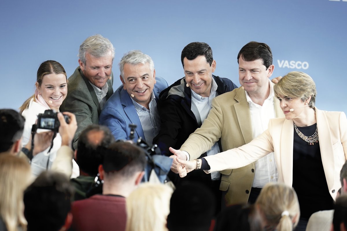 La presidenta del Govern balear, el presidente de la Xunta de Galicia, el candidato del PP a lehendakari, el presidente de la Junta de Andalucía, y el presidente de Castilla y León, en el acto de campaña del PPV. - H.Bilbao - Europa Press