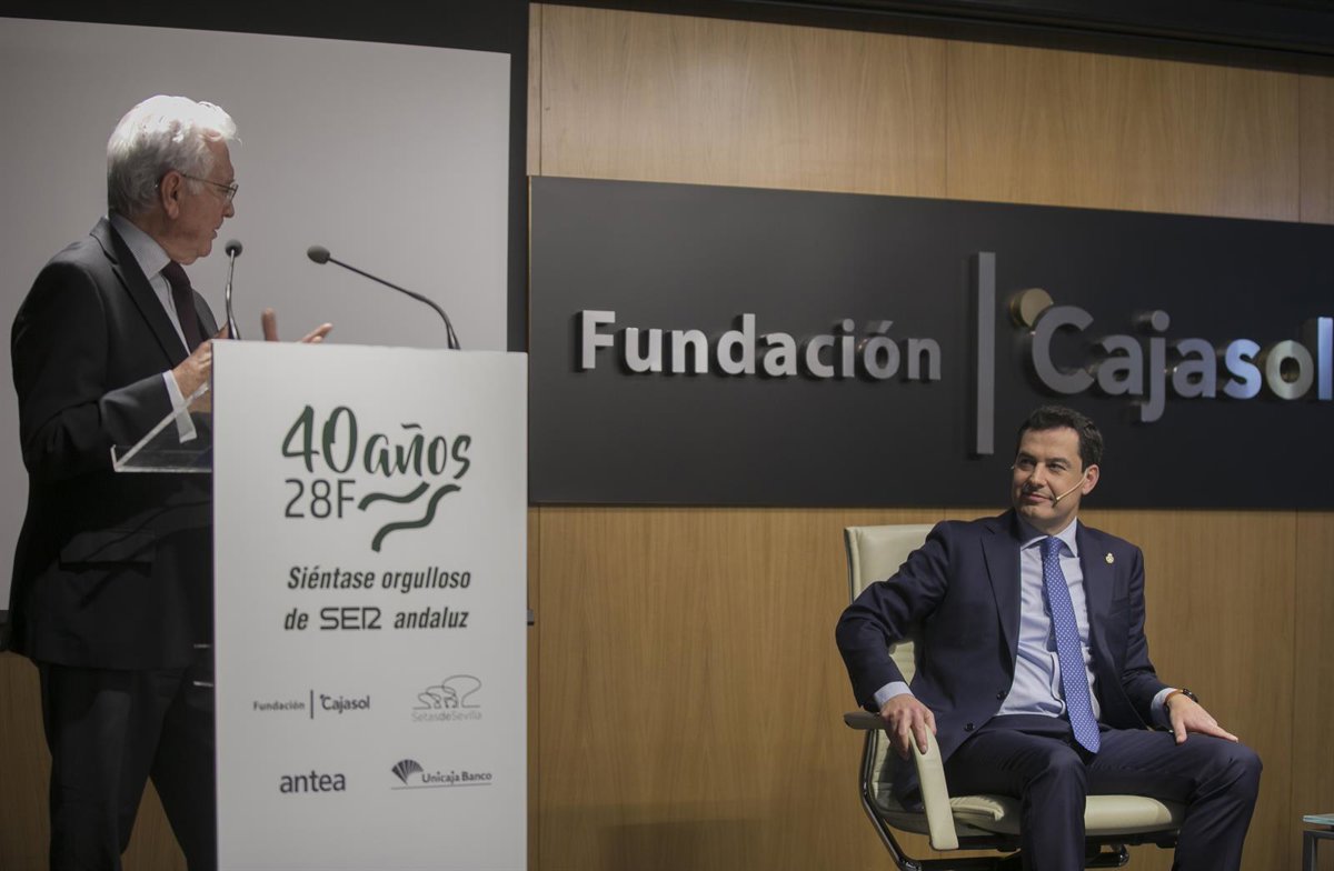 El presidente de la Junta de Andalucía, Juanma Moreno (d), junto al director general de la Cadena Ser (i), durante su intervención en el ciclo organizado por la Cadena SER sobre los 40 años de la autonomía andaluza - María José López - Europa Press
