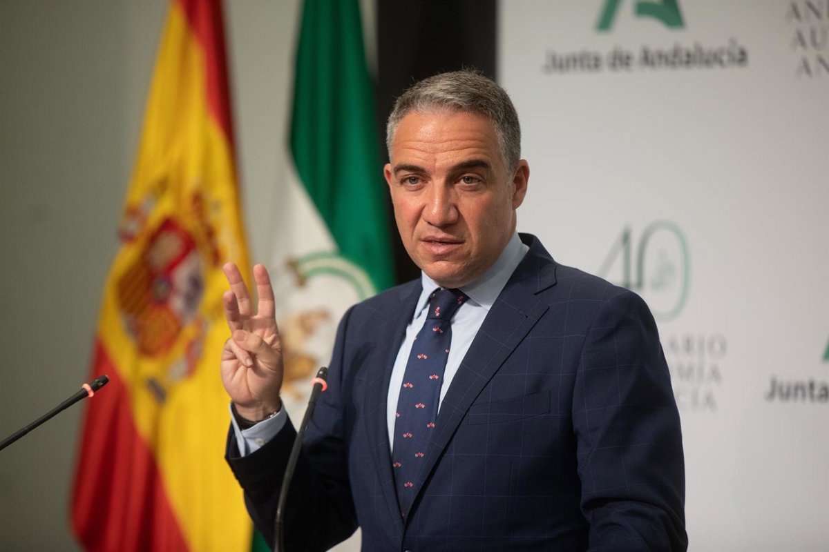 El consejero de la Presidencia, Administración Pública e Interior y portavoz del Gobierno andaluz, Elías Bendodo (d), en la rueda del prensa posterior a la reunión del Consejo de Gobierno de la Junta de Andalucía a 08 de junio del 2021 en el Palacio de - María José López - Europa Press