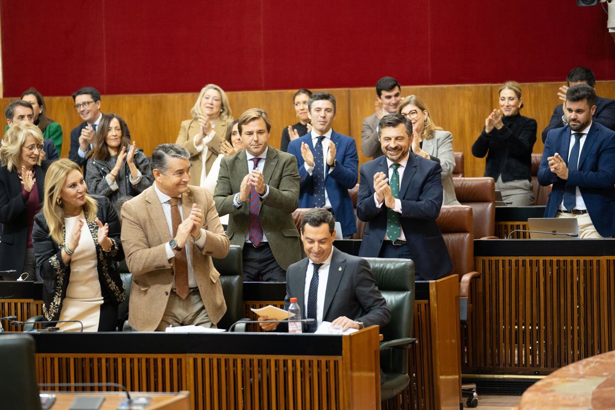 El presidente de la Junta de Andalucía, Juanma Moreno, este jueves en el Pleno del Parlamento aplaudido por su grupo parlamentario. - Eduardo Briones - Europa Press