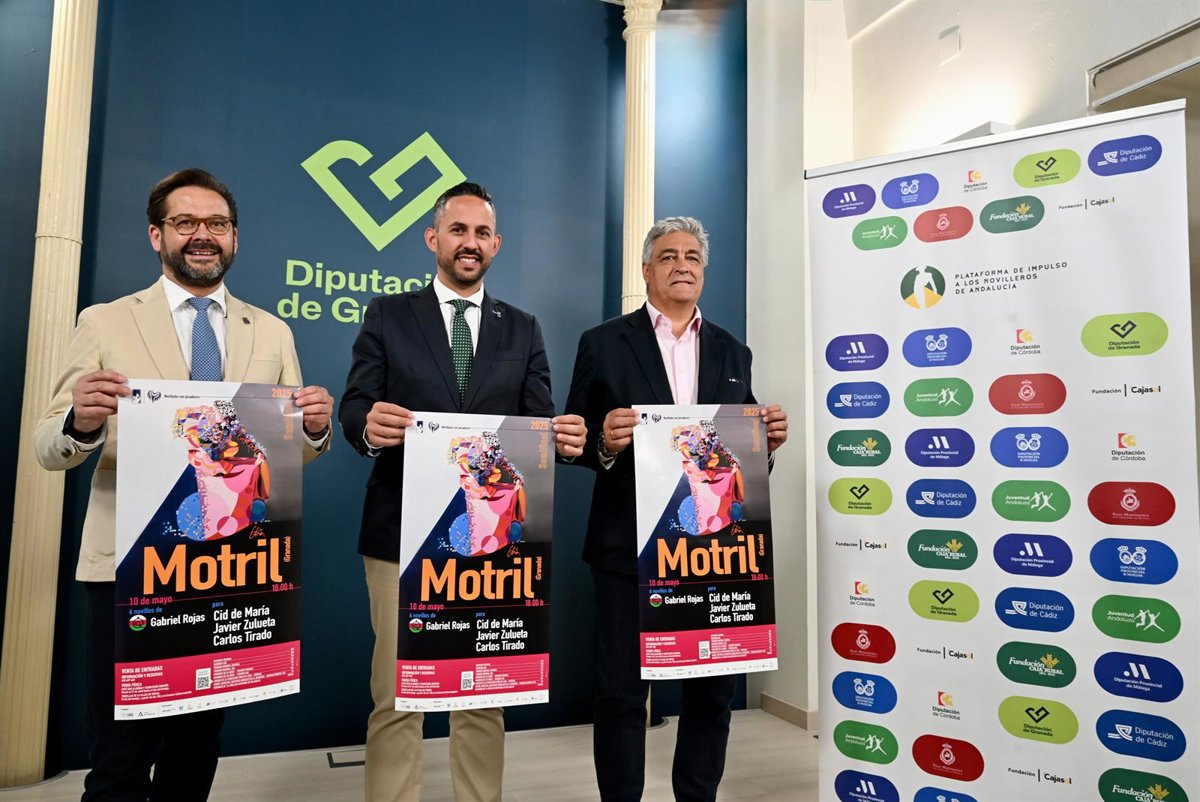 El diputado provincial de Agua, Promoción Agraria y Medio Ambiente de Granada, Antonio Mancilla, junto al delegado del Gobierno de la Junta en Granada, Antonio Granados, y el coordinador del capítulo de la Fundación Toro de Lidia en Granada, Fernando Navarro, ha presentado la segunda semifinal del Circuito de Novilladas con picadores de Andalucía, que se celebrará el próximo sábado 10 de mayo en Motril (Granada).