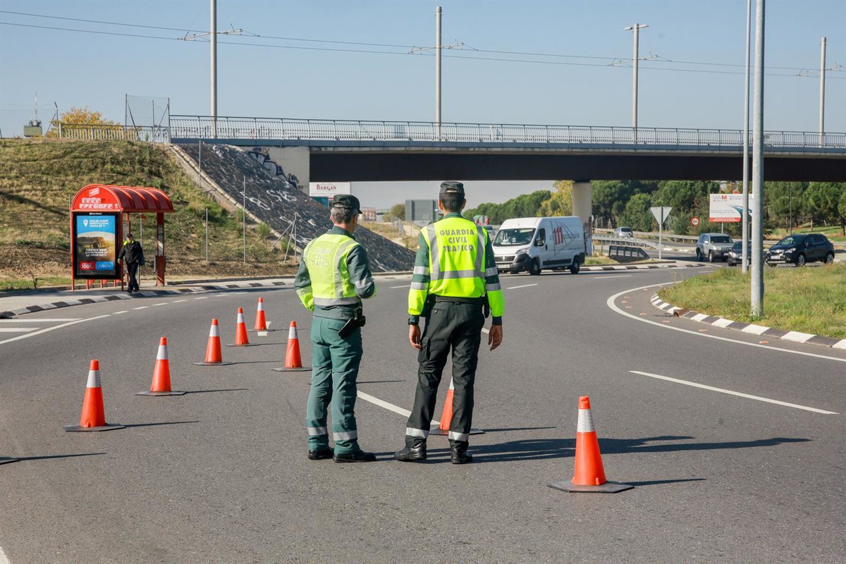 Dos agentes de la Guardia Civil de Tráfico en medio de la carretera durante la campaña especial de la DGT de vigilancia y control de furgonetas, en el Km 0,1 de la M-511, en Madrid, a 28 de octubre de 2019. - Ricardo Rubio - Europa Press - Archivo