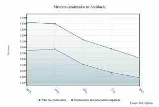 Los mismos datos ponen de manifiesto que en el 2017 fueron 2.821 los menores condenados (2.487 eran de nacionalidad española y 334 de nacionalidad extranjera). Además, la tasa de menores de 14 a 17 años condenados por cada 1.000 habitantes de ese mismo rango de edad en Andalucía en el año 2017 fue de 7,8.