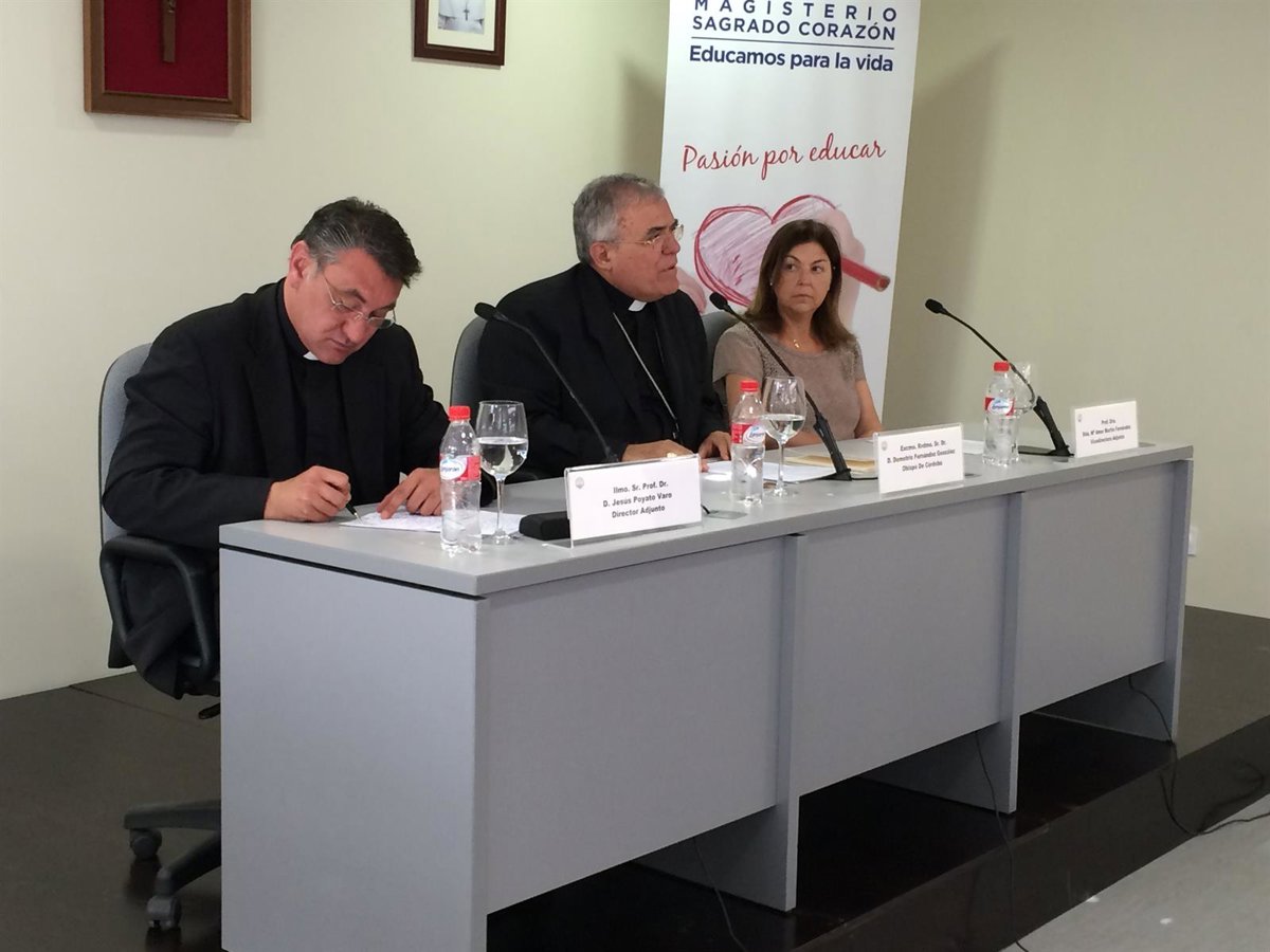 El obispo de Córdoba, Demetrio Fernández, ha impartido una conferencia en el Centro de Magisterio 'Sagrado Corazón' dirigida especialmente a los jóvenes estudiantes que están a punto de concluir sus grados en Educación Infantil y Educación Primaria, titulada 'Con otros ojos. La novedad de la fe ante el mundo, el hombre y Dios', en la que ha profundizado en la "nueva manera" con la que hay que mirar la fe en estos tiempos, en los que en la Iglesia "hay lugar para todos los colectivos".
